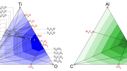 Above: Ternary convex hulls for the Ti-C-O system (left) and the Al-C-O system (right).