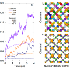 Figure caption: Quantum effects are essential for hydrogen to dynamically explore different configurations. On the left, we see how the hydrogen atoms cover much larger distances at all temperatures when quantum effects are taken into account. On the right, we see that this reflects itself in a much larger spread of hydrogen positions compared to s…
