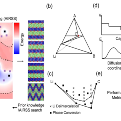 Above: schematic of the AIRSS-based framework for the discovery of new battery cathodes. In (a), the composition space potential energy surface is sampled with AIRSS, which allows the compositional phase diagram to be determined (b). Panel (c) depicts the Li-cathode pseudobinary convex hull, from which key battery metrics such as voltages, ion diff…